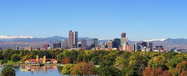 City skyline of Denver Colorado downtown with snowy Rocky Mountains and the City Park Lake.