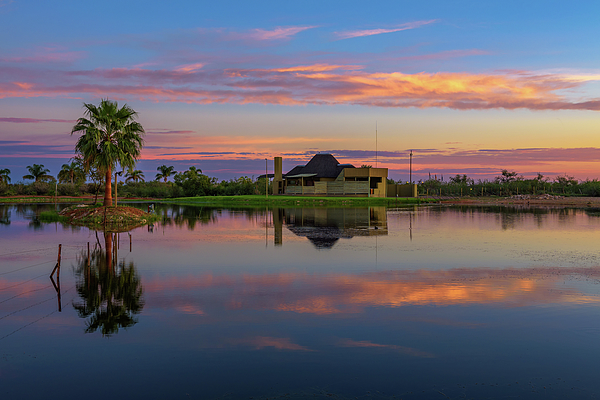 Sunrise above a luxuryLodge with a lake in the foreground located near Mariental in Namibia