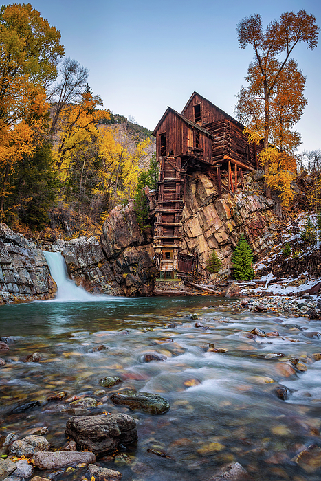 Historic wooden powerhouse called the Crystal Mill in Colorado with colorful autumn colors. It is located on an outcrop above the Crystal River in Crystal ghost town and was built in 1892.