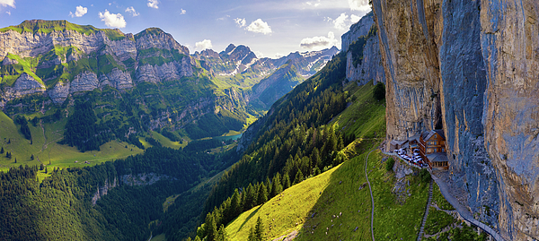 Aerial panorama of the Swiss Alps and a historic mountain restaurant under the Ascher cliff located in the Appenzell region in Switzerland