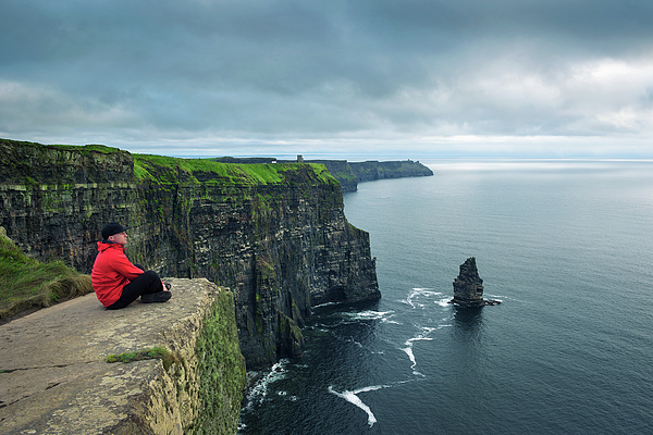 Hiker sitting at the cliffs of Moher located at the edge of the Burren region in County Clare, Ireland.