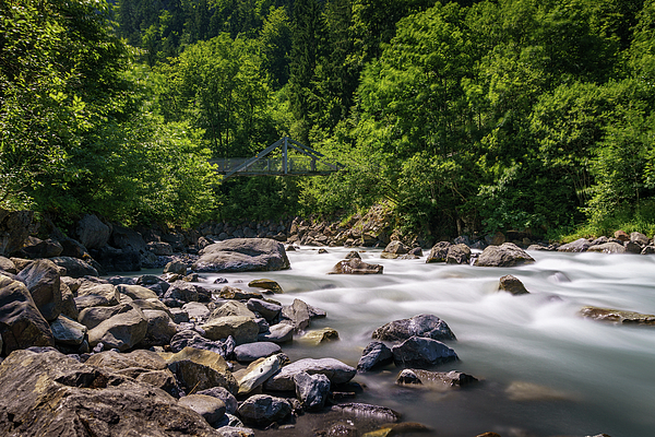 Kander river flowing near Blausee lake in the Bernese Oberland, Switzerland, with a footbridge and surrounded by thick forest.