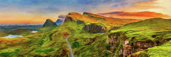 Panorama of Quiraing mountains sunset at Isle of Skye, Scottish highlands, United Kingdom, as a digital oil painting.