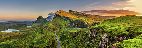Panorama of Quiraing mountains sunset at Isle of Skye, Scottish highlands, United Kingdom