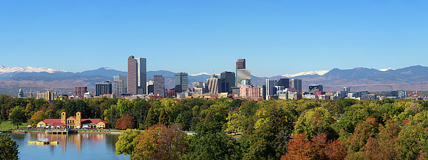 City skyline of Denver Colorado downtown with snowy Rocky Mountains and the City Park Lake. Large panorama.
