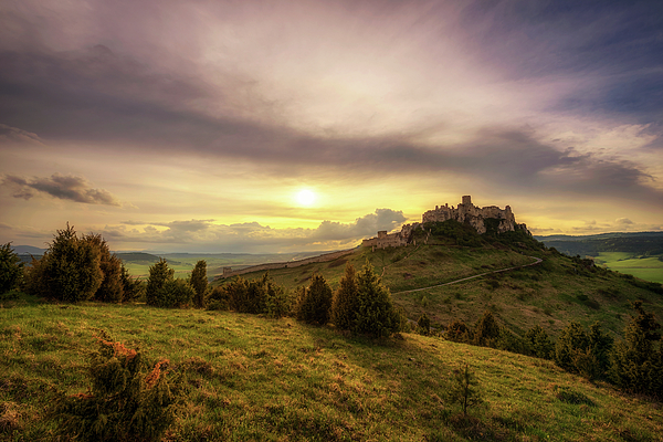Sunset over the ruins of Spis Castle in Slovakia. Spis Castle is a national monument and one of the biggest European castles by area.