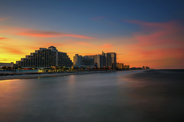 Sunset skyline of Daytona Beach, Florida, photographed from the fishing pier. Long exposure.