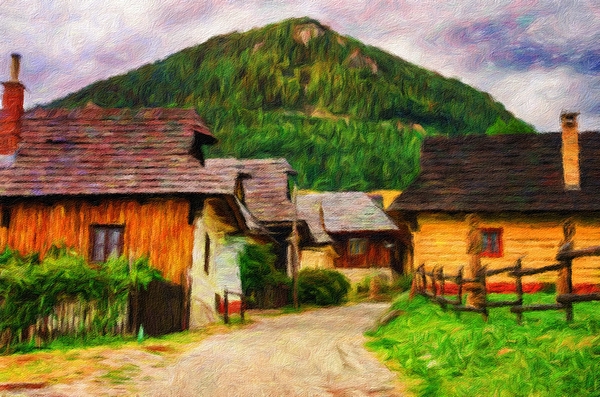 A historic village in Slovakia which is part of the UNESCO World Heritage since 1993 as a digital oil painting
